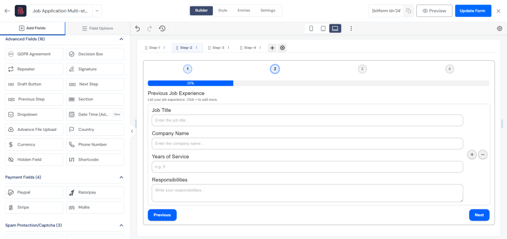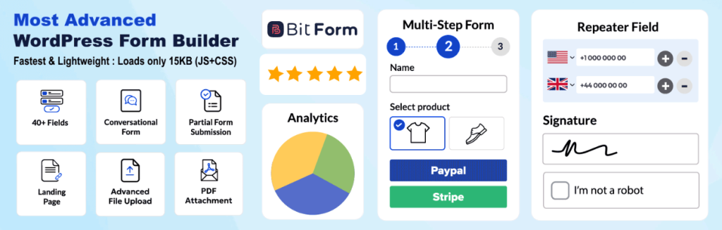 Bit Form focuses on performance and flexibility. You can add unlimited steps, show progress indicators, and dynamically control fields based on user input. This makes it ideal for registrations, surveys, applications, lead generation, and payment forms.