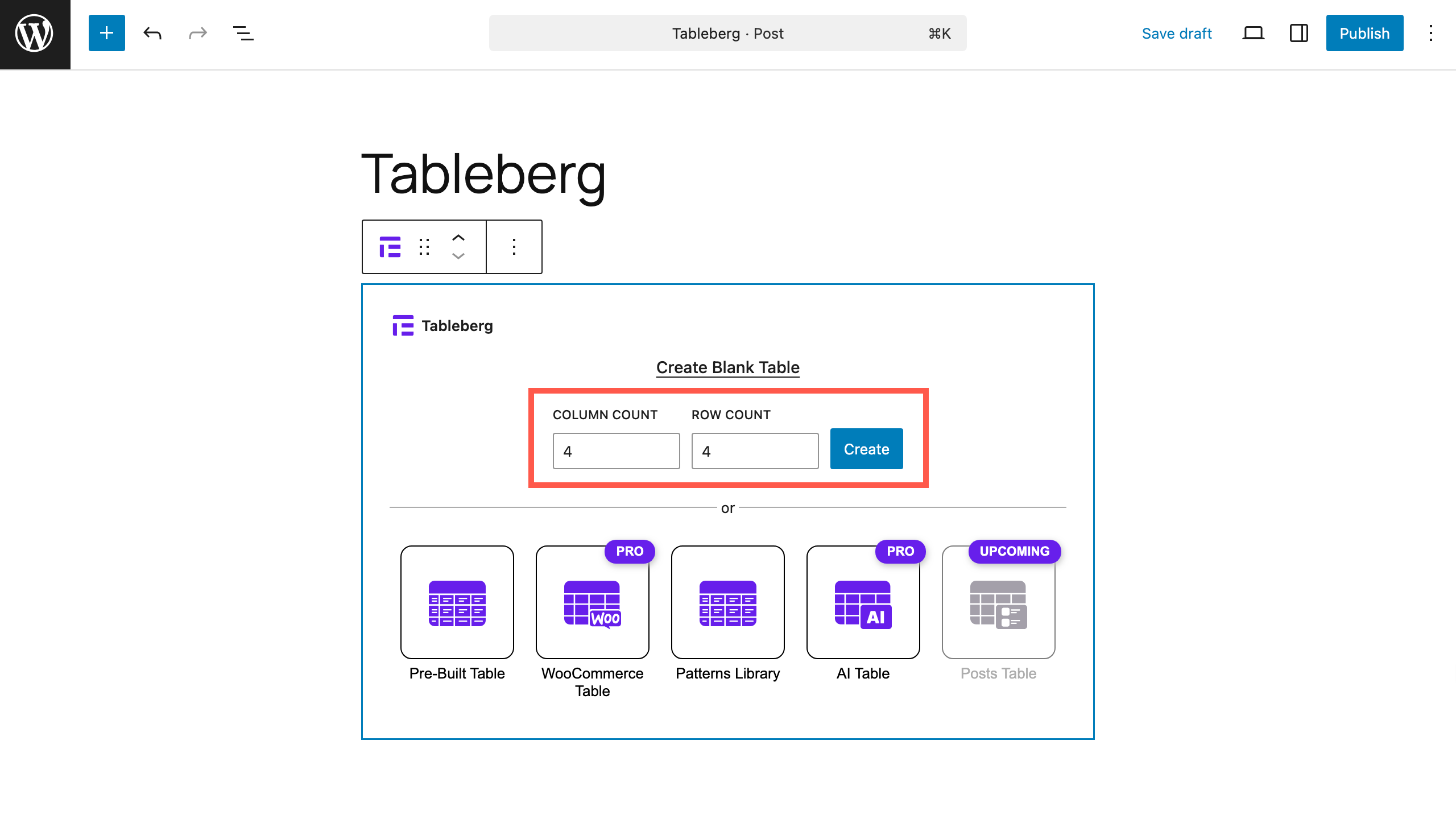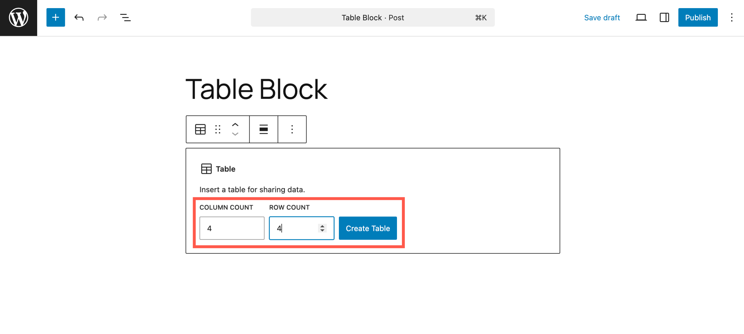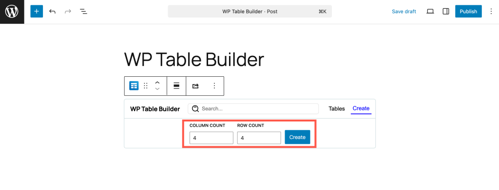 Once you insert the Table block, you will be prompted to select the number of rows and columns. Enter the number of columns and rows you need and click ‘Create Table