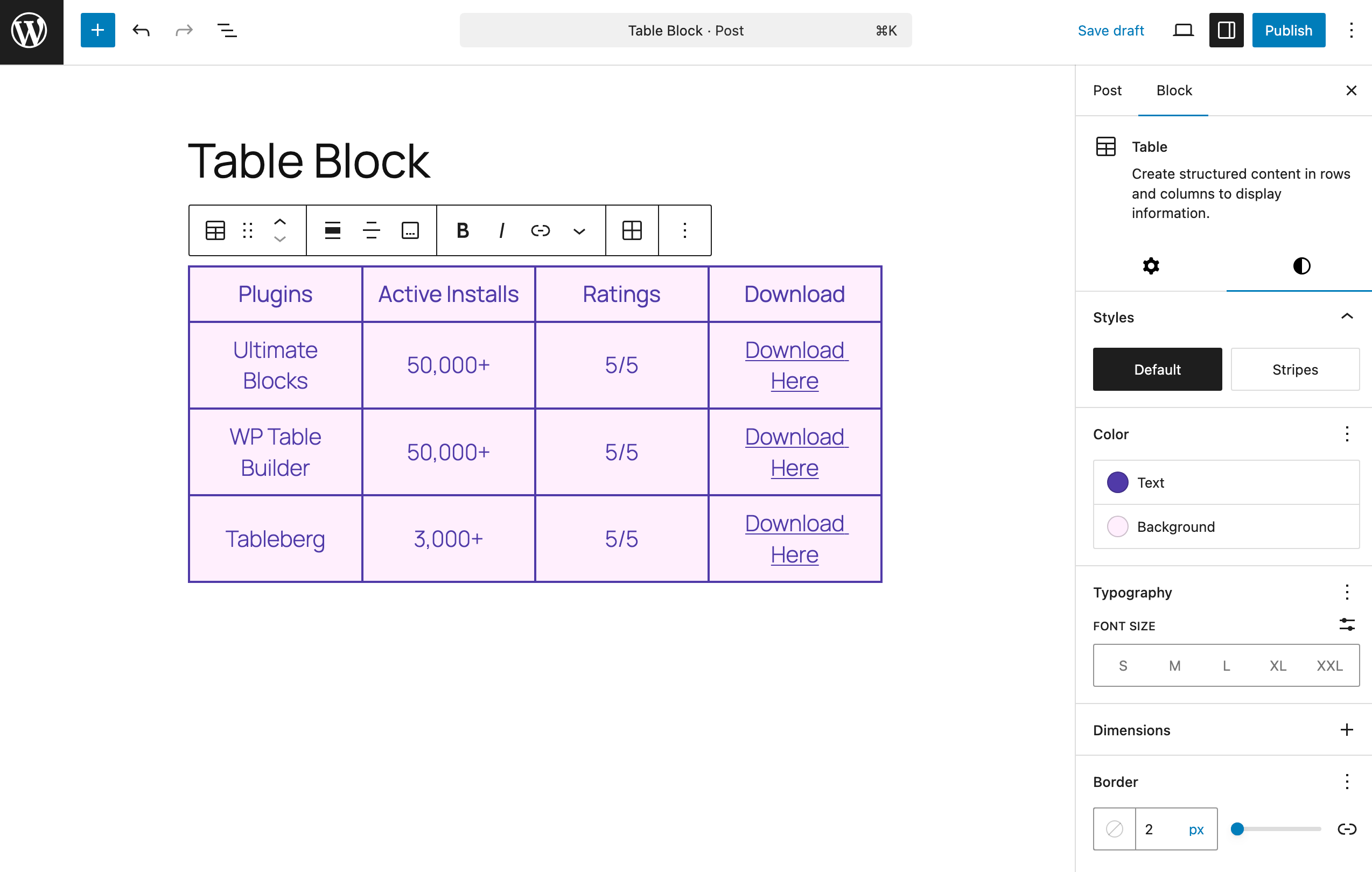 If you only need basic tables with text or numbers, the default Table block is quick, lightweight, and perfectly sufficient. It’s a great option for simple layouts and minimal content.